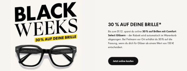 Bei Fielmann ist ebenfalls die Black Week gestartet, dort bekommt ihr 30% Rabatt auf Brillen mit Comfort Select Gläsern