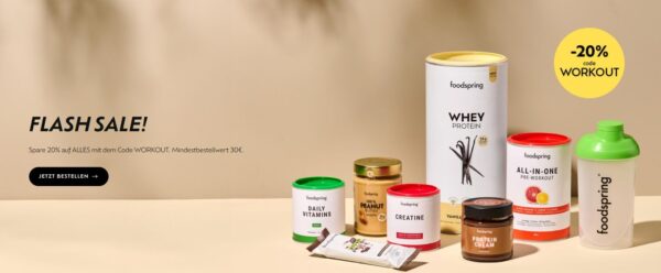 Im Onlineshop von Foodspring könnt ihr euch gerade 20% Rabatt auf alle Foodspring-Produkte sichern.