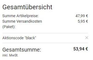 - Bedingungen: Bis zum 29.11. 20% auf eine große Auswahl an Marken sichern. Einfach im Warenkorb den Aktionscode black eingeben und der Nachlass wird abgezogen. Gültig auf GALERIA.de für Produkte ausgewiesen mit „verkauft durch GALERIA“. Nicht nachträglich für bereits gekaufte Ware und nicht in Verbindung mit anderen Rabattaktionen und Aktionscodes einsetzbar. Nicht gültig für Geschenk-/ Guthabenkarten, Bücher, Zeitschriften, Services, Lebensmittel, Reisen, Elektrogeräte, Matratzen, Wein, Spirituosen, Multimedia, Spielekonsolen, Videospiele, E-Scooter und folgende Marken: galeria.de/prozent-ausschluss.