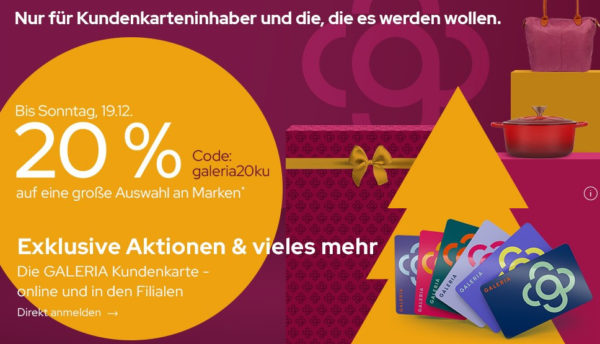 Matthi 05.12.2021, 17:07 # hilfreichFür Kundenkarteninhaber gibt es aktuell auf eine große Auswahl an Marken 20% mit dem Code galeria20ku.