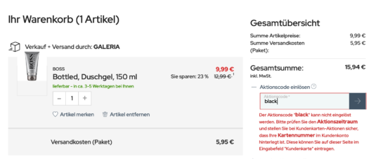 Um auch den Rabatt zu erhalten, muss man sich die kostenlose Kundenkarte bestellen, oder bereits besitzen und den Gutschein-Code galeria20ku verwenden.