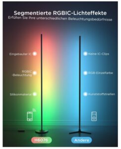 - Dynamische RGBIC Farbe: Entfesseln Sie Ihre Kreativität mit der Govee RGBIC-Technologie und sie können jedes Segment farblich an Natur, Festival und Emotionen anpassen. Unserer Stehlampe wohnzimmer zeigen gleichzeitig animierte Mehrfarbeneffekte, weihnachten deko.
