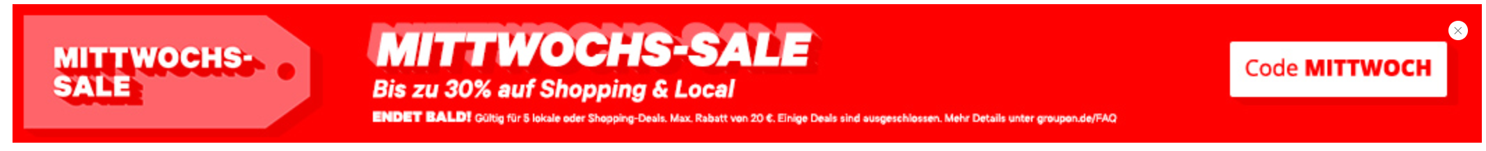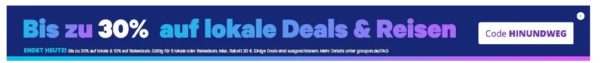 Bei Groupon erhaltet ihr am heutigen Sonntag bis zu 30% Rabatt auf lokale & Reise-Deals & Shopping-Deals. 🙂