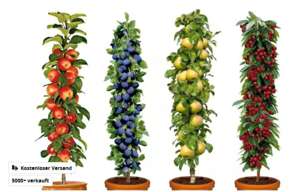 - Lieferumfang: Säulenbirne Doyenné du Comice, Säulenkirsche Stella, Säulenpflaume Black Amber und Säulenapfel Malus Braeburn
