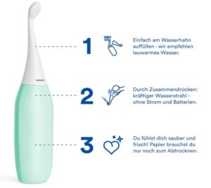 - Ersatz für feuchtes Toilettenpapier, reduziert den Bedarf mind. um 50%. Empfohlen bei Krankheiten, sensibler Haut und hohem Hygienebedarf.