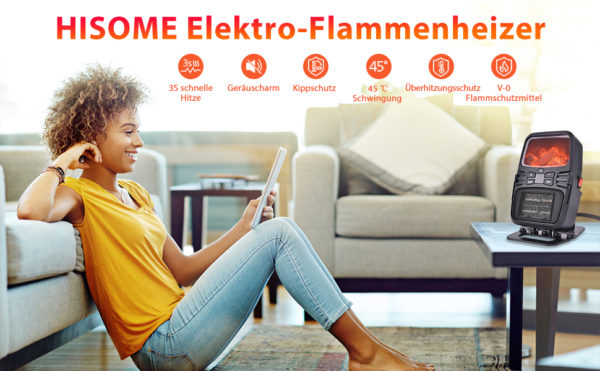 Hisome Heizlüfter (Ventilator, Flammeneffekt, Umkippschutz, 15-32 Grad) für 27,99€