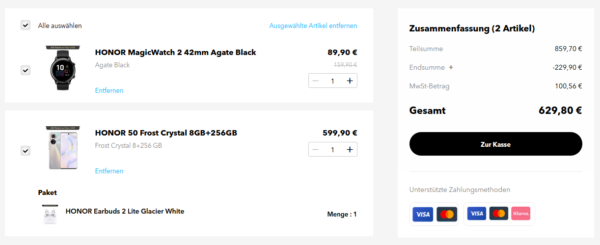 - Oder das HONOR 50 Frost Crystal 8GB+256GB + gratis Honor Ear Buds 2 Lite + Honor Magic Watch 2 für effektiv 629,80€ (Vergleichspreis: ~599€ + 80€ + 135€) Ersparnis ~184€