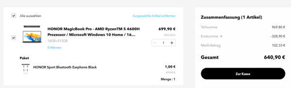 - HONOR MagicBook Pro – AMD RyzenTM 5 4600H Prozessor / Microsoft Windows 10 Home / 16 RAM, 512 SSD / PCIe NVMe SSD + HONOR Sport Bluetooth Earphone Black (für 1€) dank 60€ Rabatt für nur 640,90€ (Vergleichspreis: ~799€ +99€) Ersparnis ~258€