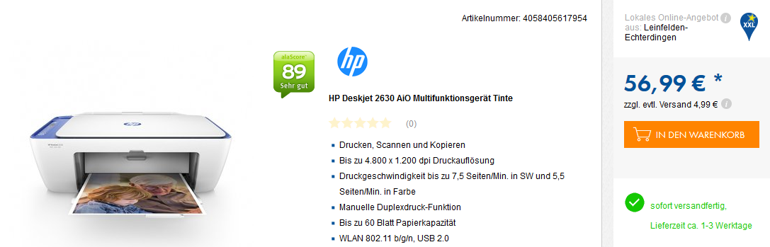 Denn im heutigen Deal des Tages bekommt man bei Euronics den HP Deskjet 2630 (AiO, Multifunktionsgerät) für 39€ (Vergleichspreis: ~54€) Ersparnis ~15€.
