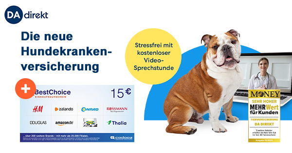 Zum Glück gibt es die DA Direkt Versicherung auch für Hunde. Los geht es ab 29,90€ im Monat und auch hier gibt es von MonsterDealz einen 15€ BestChoice-Gutschein dazu.