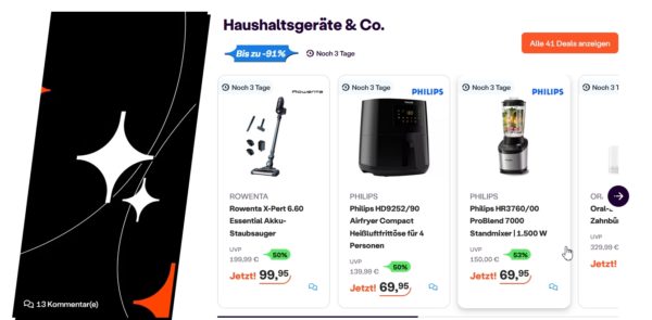Stöbert auf jeden Fall mal auf der Startseite herum, denn dort findet ihr neben den Zeitdeals auch noch viele weitere Kategorien mit Rabatten, die kein Zeitlimit haben und sich zum Teil auch sehen lassen können. 🙂