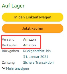 Und auf der Produktdetailseite kann man dann sofort sehen, ob Amazon der Verkäufer ist: