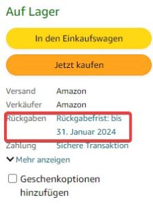 Viele von euch schrecken auch davor zurück, schon womöglich jetzt Weihnachtsgeschenke zu kaufen, weil man diese später möglicherweise nicht mehr umtauschen kann. Auch diese Angst ist hier unbegründet. Für die meisten Produkte gilt aktuell ein verlängertes Rückgaberecht bis zum 31. Januar 2024. Ob das für das jeweilige Produkt gilt, kann man einfach auf der Produktdetailseite prüfen. Diese Regelung gilt übrigens auch für viele Produkte anderer Verkäufer.