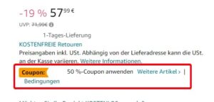 Aktiviert dazu einfach den 50% Coupon auf der Produktseite und schon kommt ihr auf den genannten Preis.