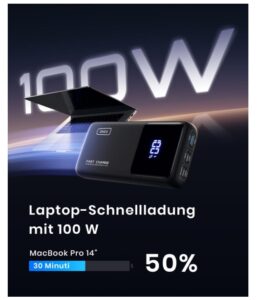 - 100W Tip Laptop Charging: Erhöhen Sie Ihr Ladeerlebnis mit unserer innovativen Powerbank. Optimiert, um eine unglaubliche Leistung von 100W zu liefern, bietet sie blitzschnelles Laden für Spitzen-Laptops, so dass Sie produktiv bleiben können, ohne an eine Steckdose gebunden zu sein.