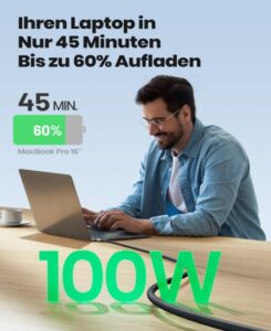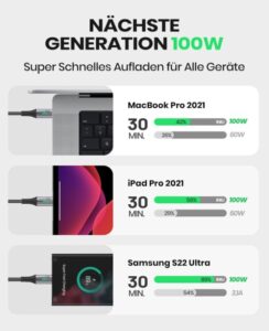 - Die beispiellose 5A 100W PD-Technologie bringt die Ladegeschwindigkeit auf die nächste Stufe – unglaublich schnelles Aufladen von Ihrem Samsung Galaxy S22 bis zu 89% in 35 Minuten oder von Ihrem MacBook Pro bis zu 100% in nur 1,9 Stunden.