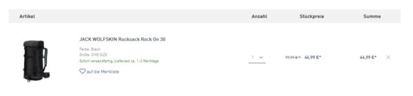 Bei Intersport bekommt ihr heute als Tagesangebot den JACK WOLFSKIN Rucksack Rock On 30 für 44,99€