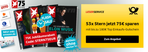 Beim Leserservice der Deutschen Post erhaltet ihr jetzt als Flashdeal das Jahresabo Stern für 232,40€ + bis zu 175€ Prämie. 🙂