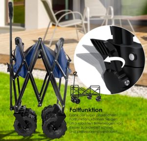 - Mit nur wenigen Handgriffen lässt sich der große Bollerwagen zusammenfalten und platzsparend verstauen