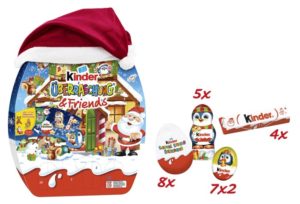 - Lieferumfang: 1 x kinder Überraschung & Friends Adventskalender à 404g inkl. 8x kinder Überraschung, 5x kinder Schokolade Hohlfigur, 7×2 kinder Schokolade Taler, 4x kinder Schokolade