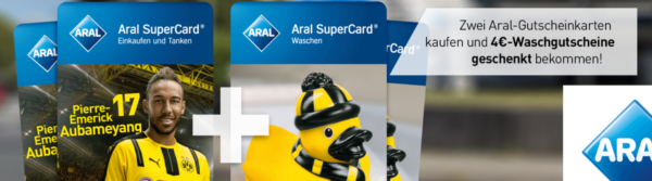 Ihr könnt dort 2×5€ Aral Gutscheinkarten für 10€ kaufen und erhaltet 2×2€ Waschkarten gratis dazu.
