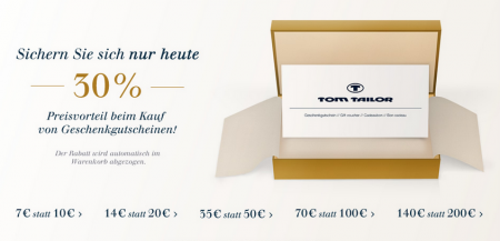 *KRACHER* 30% Rabatt auf TomTailor Geschenkgutscheine – MIT TRICK KOMBINIERBAR!!!