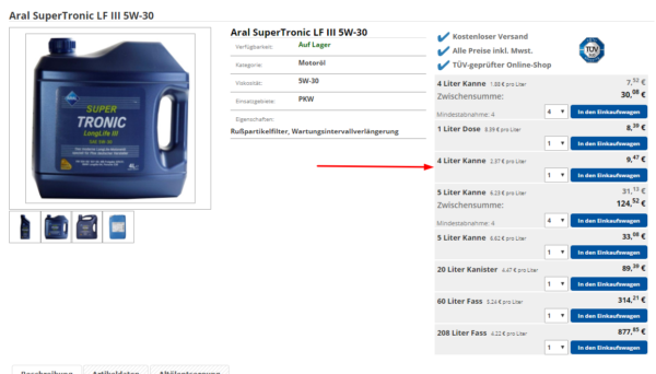 Bei Reifendirekt bekommt ihr nun einen richtigen Knaller, dort bekommt ihr 4 Liter Aral SuperTronic LF III 5W-30 Motoröl für 9,47€ (Vergleichspreis ~27€) Ersparnis ~18€