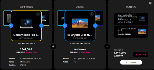 - SAMSUNG Book Pro 360 5G für 1.349€ (wenn ihr das Minispiel mitmacht, gibt es nochmal 5% Rabatt) (Vergleichspreis: ~2.189€) Ersparnis ~907€ + GRATIS 43″ UHD 4K Smart-TV (PVG: ~474€)