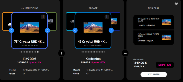 - SAMSUNG 75″ Crystal UHD Smart-TV für 1.149€ (wenn ihr das Minispiel mitmacht, gibt es nochmal 5% Rabatt) (Vergleichspreis: ~1.600€) Ersparnis ~508,45€ + GRATIS 50″ UHD 4K Smart-TV (PVG: ~474€)