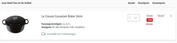Im Onlineshop von Lidl bekommt ihr gerade den Le Creuset Gourmet Bräter (24cm Durchmesser) für 139€ (Vergleichspreis ~169€) Ersparnis ~30€