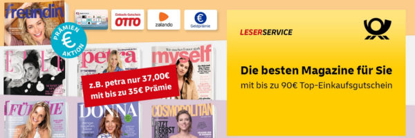 Beim Leserservice der Deutschen Post erhaltet ihr jetzt einige Zeitschriften im Jahresabo mit erhöhten Prämien. 🙂