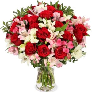 Du suchst einen Blumenstrauß für einen ganz besonders schönen Liebesbeweis? Dann suche nicht weiter. Denn dieser herrliche XXL Liebesgruß erstrahlt mit bis zu 100 Blüten und wird für leidenschaftliche Freude sorgen. Das liebevolle Arrangement aus herrlich duftenden roten Rosen und exotischen weißen Inkalilien begeistert mit seiner romantischen Gestaltung und lässt alle Herzen höher schlagen. Ein super Blumenstrauß als Zeichen der ewigen Liebe und Verbundenheit.