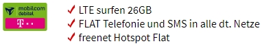 - Surfen: 26 GB Internet-Flatrate (mit bis zu 21,6 Mbit/s, danach 64 Kbit/s)