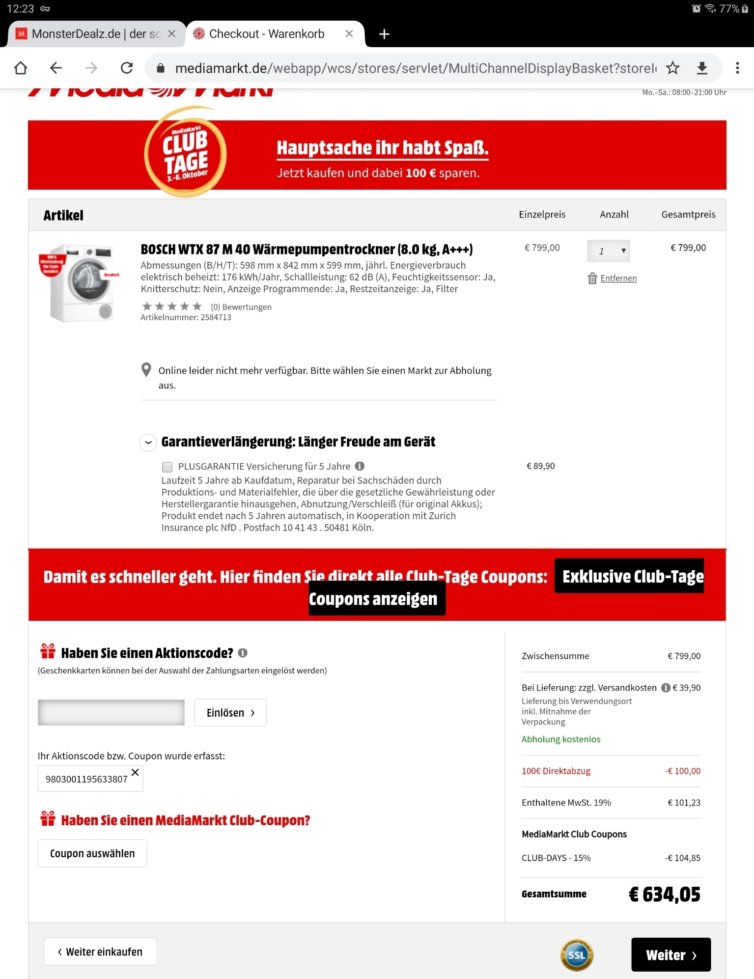 • Rabatt wird im Warenkorb automatisch abgezogen, wenn Sie als Club-Mitglied angemeldet sind