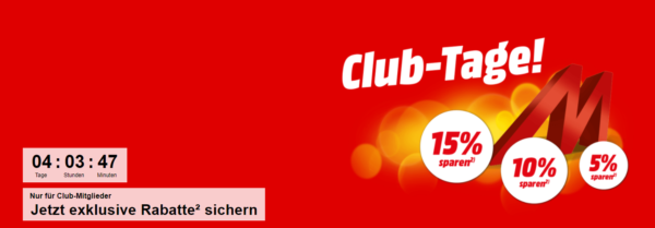 Bei MediaMarkt finden nun die sogenannte Club Tage im Online-Shop statt. Club-Mitglieder erhalten im Aktionszeitraum Rabatte bis zu 15% Rabatt auf unterschiedliche Warengruppen. Wie immer, haben wir für euch eine kleine Übersicht erstellt.