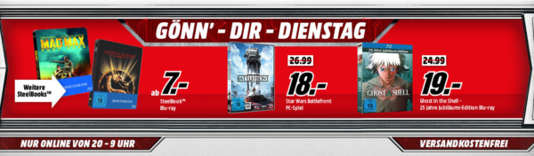 Bei Mediamarkt gibt es heute wieder den „Gönn‘ dir Dienstag“ , welcher bis Morgen 09:00 Uhr läuft.