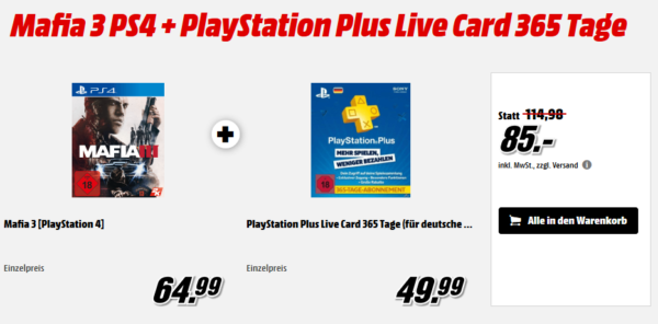 - Mafia 3 [Playstation 4] + Playstation Plus Live Card 365 Tage für 85€ + 4,99€ (Vergleichspreis: ~57€ + ~44€) Ersparnis ~11€ bzw. 16€ bei Marktabholung