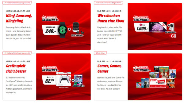 MediaMarkt hat eine wirklich tolle Aktion gestartet die nur bis zum 18.12.2021 19:59 Uhr gilt. Ihr erhaltet beim Kauf von Produkten noch weitere Produkte oder Geschenkkarten kostenlos dazu.