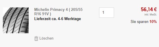 Na, noch neue Schlappen für den Sommer gesucht? Bei Rakuten bekommt ihr gerade die Michelin Primacy 4 (205/55/16 91V) Sommerreifen für 50,53€ (Vergleichspreis ~69€) Ersparnis ~18€