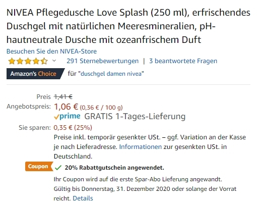 Denn bei Amazon bekommt man auf unbestimmte Zeit das Nivea Love Splash Duschgel (250ml) für 0,74€ (Vergleichspreis: ~2€) Ersparnis ~1€