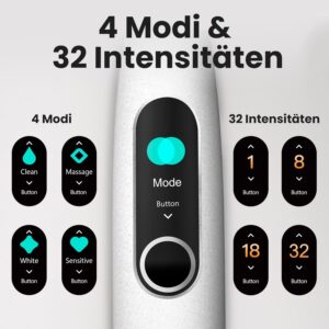 - INDIVIDUELLES ZÄHNEPUTZEN – Diese Schallzahnbürste verfügt über 4 Reinigungsmodi (Clean, Sensitive, Massage, Whitening) und 32 Intensitätsstufen, damit Sie den Modus und die Intensität wählen können, die am besten zu Ihnen passen. Xpro Elite kann auch auf intelligente Weise ein Programm empfehlen, das auf Ihren Putzgewohnheiten basiert, oder Sie können Ihr eigenes Programm einstellen.