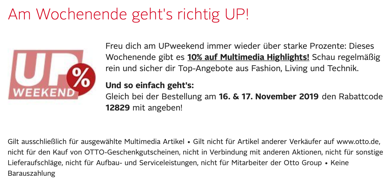 Es ist wieder UPweekend bei OTTO! Das heißt, es gibt wieder eine Menge an Angeboten in einer bestimmten Kategorie, die übers Wochenende laufen 🙂