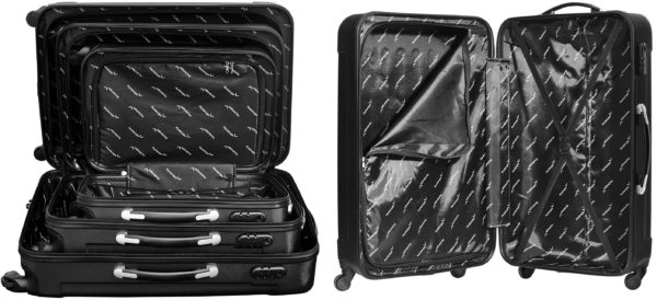 Bei Set ist für jede Reise der passende Koffer dabei, denn der XL-Koffer eignet sich für lange Reisen, der klassische Reisekoffer in Größe L und für Kurztrips der Handgepäcktaugliche Koffer M. Das Trio ist aus kratzfestem ABS hergestellt, die Griffe aus Aluminium sowie mit zwei Tragegriffen an Längs- und Oberseite die ermöglichen ein einfaches transportieren der Hartschalenkoffer. Was besonders praktisch ist ist, dass alle Koffer sich um 360° drehen lassen. Der Kreuzgurt im Innenraum sichert die Wäsche vor Verrutschen. Aufteilung in zwei Fächer durch Zwischenboden mit Reißverschluss.
