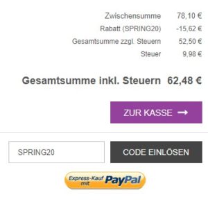 Gutscheincode: SPRING20| Wendet diesen Gutscheincode im Warenkorb an und erhaltet den Rabatt.