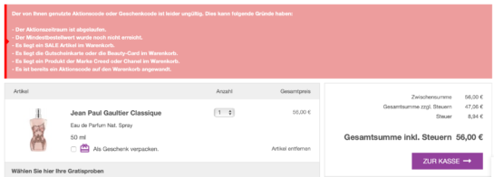 Ausgenommen von der Aktion: Produkte die in der Kategorie „%Sale“ liegen, BeautyCARD, Gutscheinkarte, Jo Malone London, La Mer, The Ordinary, W7, Atelier PMP, biehl. parfumkunstwerke, Saskia Diez, Escentric Molecules, The Beautiful Mind Series, NASENGOLD, Kinski Fragrance, Verdúu, WACKELWASSER