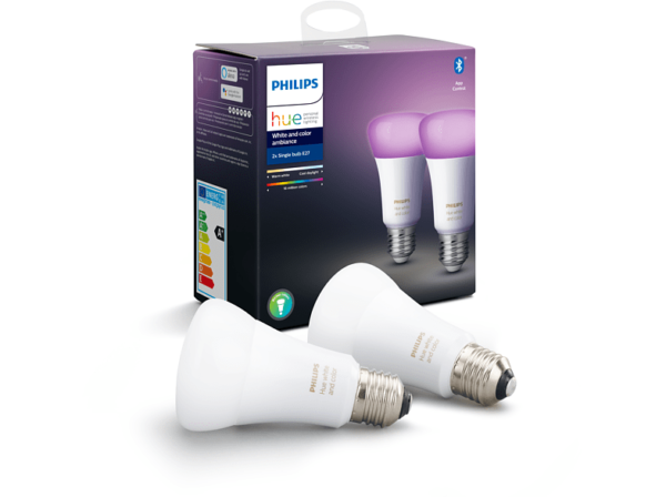 - 2x Hue E27 LED Lampe – Einfache Einrichtung per Bluetooth: Hue Lampe eindrehen, Hue Bluetooth App downloaden und bis zu 10 Lampen in einem Raum dimmen oder Lichtszenen einstellen, ganz ohne aufwändige Installation.