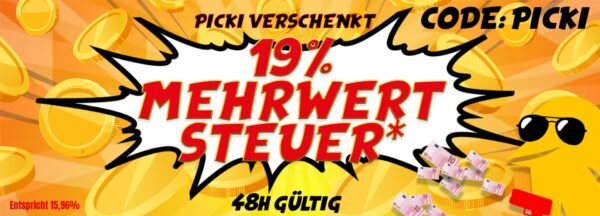 Bei PickSport erhaltet ihr nur für kurze Zeit die MwSt. geschenkt und somit satte 15,97% Extra-Rabatt!