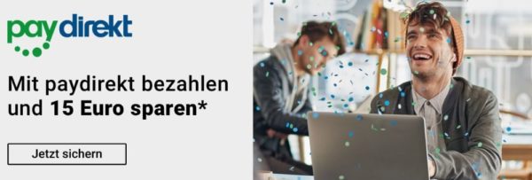 Ihr erhaltet bis zum 31.12.2019 18:00 Uhr einen 15€ Gutschein (MBW 30€), wenn ihr mit paydirekt bezahlt.