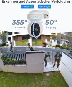 - Menschen-/Fahrzeugerkennung und Automatische Verfolgung: Mit der fortschrittlichen intelligenten Bewegungserkennung kann diese IP-Kamera Personen und Fahrzeuge von anderen Objekten unterscheiden. Sie können spezifischere Benachrichtigungen erhalten und mit einem Blick auf den Bildschirm des Handys sofort erfahren, was Warnungen auslöst. Gleichzeitig kann sie automatisch der sich bewegenden Person/Auto folgen und Ihnen mehr Sicherheitsschutz bieten