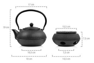 - Lieferumfang: 1x Gusseisen Teekanne mit Deckel – Maße: (ØxH) 17×14 cm/ (H) mit Henkel: 20 cm 1x Teesieb aus Edelstahl 1x Stövchen aus Gusseisen – Maße: (ØxH) 14×7,5 cm, 2x kleine Tassen aus Gusseisen – Maße: (ØxH) 8×5,5 cm/ Füllmenge: 150 ml, 2x kleine Untertassen aus Gusseisen – Maße: (Ø) 10 cm